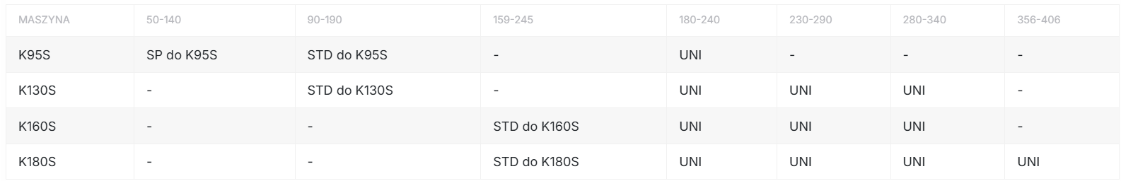 Ponadto z tabeli powyższej widać, że te kolejne stożki 180-240 mm, 230-290 mm i 280-340 mm, oznaczone jako UNI, można wykorzystać do wbijania rur przy pomocy innych maszyn przeciskowych: K160S oraz K180S. Dla tych dwóch kretów trzeba jedynie posiadać dedykowane do nich stożki podstawowe 159-245.